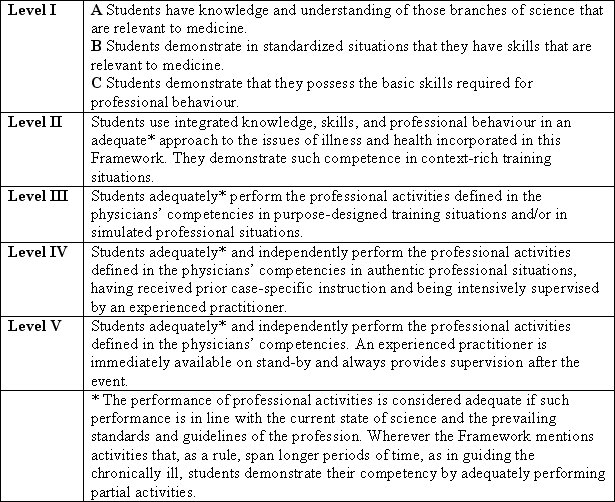 The Project Group was asked to pay special attention to finding formulations that are realistic and testable and that allow external accountability for medical education programme content. This prompted the Project Group to clearly define the competencies in terms of levels that are to be attained.