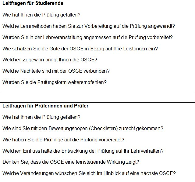 Unmittelbar nach der Durchführung der OSCE wurden 40 Studierende, zehn Studierende pro Parcours (28 Prozent), in Form eines Kurzinterviews zur Prüfung befragt (siehe Abbildung 3 [Abb. 3]). Die Befragung fand in festgelegten Zeitabständen parallel in den Parcours statt. Es wurden lediglich Einzelpersonen befragt. Weiter wurden alle beteiligten Lehrenden/Prüfenden nach Beendigung der OSCE zur Prüfungssituation befragt. Die Befragung wurde vom Studiendekanat und der Klinik für Neurologie durchgeführt. Beide Gruppierungen wurden zur Akzeptanz der Prüfung, zu den Lerneffekten und zum Lern- bzw. Lehrverhalten befragt. Für die Gesprächssituation wurden Leitfragen mit diskursivem, dialogischen Charakter entwickelt [15], [16].
