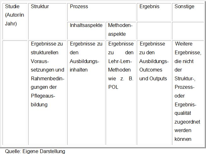 - Struktur: Hierunter wurden Studienergebnisse subsumiert, die Auskunft darüber geben, welche Strukturmerkmale sich hemmend oder fördernd auf die Pflegeausbildung auswirken.