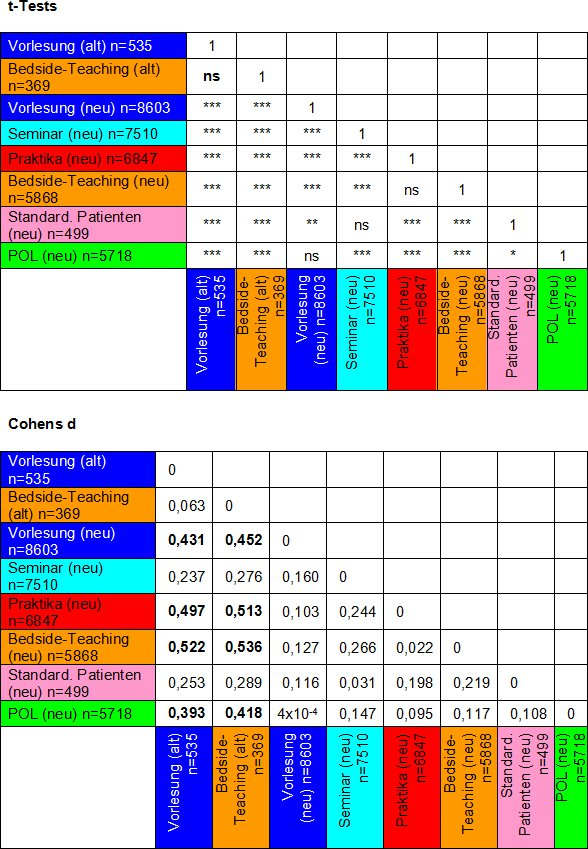 Tabelle 3: Statistischer Vergleich der Gesamtevaluation unterschiedlicher Lehrveranstaltungsformen des traditionellen (alt) und neuen Curriculums (neu). Oben: Signifikanz der Unterschiede. (Varianzanalyse ergab p=2,6x10-101.) Unten: Effektstärke (Cohens d). Die Daten wurden zusammengefasst wie in Abb. 2B. Die Farben entsprechen Abb. 3A. (ns) Nicht signifikant; (*) p<0,05; (**) p<0,01; (***) p<0,001; (Standard. Patienten) standardisierte Patienten.
