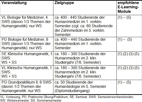 Tabelle 2: Organisation der Lehre und Einsatz der E-Learning-Module in Humangenetik am Fachbereich Medizin der Philipps-Universität Marburg