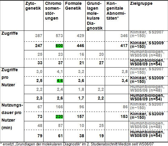 Als Zugriff wird der Aufruf eines E-Moduls (z. B. Zytogenetik mit 29 Bildschirmseiten) definiert. Aufgrund organisatorisch-technischer Probleme u. a. bedingt durch Implementierung der neuen Open Source Lernplattform ILIAS (Integriertes Lern-, Informations- und Arbeitskooperations-System, http://www.ilias.de/docu/) im September 2005 war eine Filterung der Lernkursnutzung nach Nutzergruppe nicht in allen Semestern möglich (siehe Tabelle 4 [Tab. 4]). Die Usertracking-Daten sind daher vorwiegend kumulativ in Bezug auf die Gesamtgruppe der Nutzer dargestellt (siehe Tabelle 3 [Tab. 3]). Als „Nutzer“ (n) sind Teilnehmer der jeweiligen Lehrveranstaltungen (siehe Tabelle 2 [Tab. 2]) definiert. Eine zeitliche Analyse der Tracking-Daten, um z. B. eventuelle Nutzungs-Peaks darzustellen, war angesichts der gegebenen personalen und technischen Ressourcen zu aufwendig.