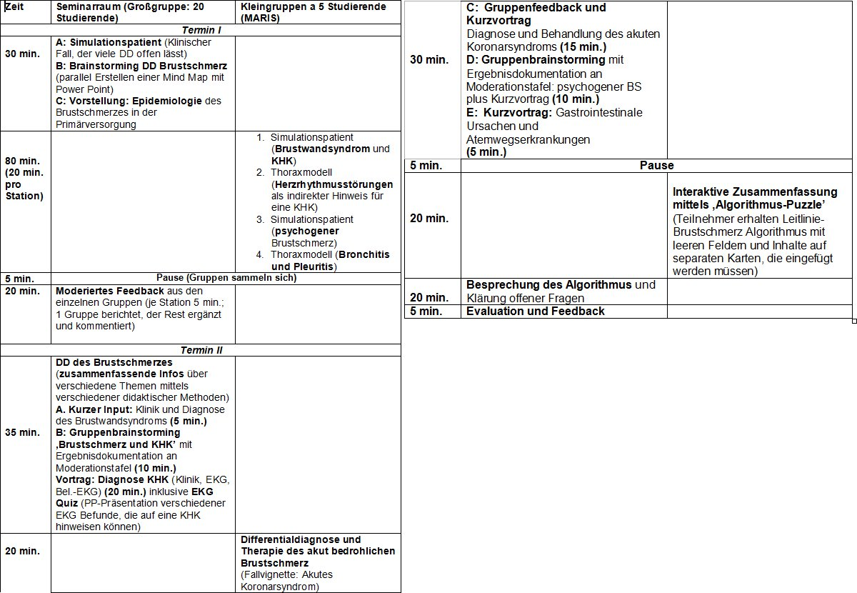 Nach einer Kurzpräsentation von Ergebnissen hausärztlicher symptomevaluierender Studien zu den zugrundeliegenden Krankheitsprävalenzen schloss sich eine ausgedehnte Kleingruppenarbeit an, in der mittels Simulationspatienten und verschiedenen Modellen entweder verschiedene abwendbar gefährliche Verläufe oder eine Reihe anderer, eher chronischer Krankheiten simuliert wurden. Die Studierenden rotierten hierbei in Kleingruppen von 4-5 Teilnehmern durch 3-4 verschiedene Stationen, die jeweils von einem Tutor betreut wurden. Als Ergänzung dienten zudem Kurzvorträge, verschiede Quizz Formate (EKG Quizz, Sono-Bilder-Quizz) oder kürzere interaktive Kleingruppenübungen (z.B. Algorithmus-Puzzle: hier mussten die Studierenden in einen leeren Algorithmus die richtigen Inhalte als abschließende Lernkontrolle nach einer Seminareinheit einfügen). Zur Nachbereitung wurde neben den eigentlichen Seminarunterlagen weitere Literatur als obligates und fakultatives Lesematerial auf der elektronischen Lernplattform „k-Med“ online zur Verfügung gestellt. Tabelle 3 [Tab. 3] beschreibt exemplarisch den Ablauf einer Doppeleinheit aus 6 Unterrichtsstunden für das Leitsymptom Thoraxschmerz.