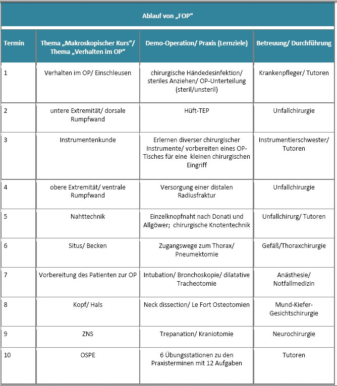 Projektvorstellung: „Fit für den OP!?“ (FOP) ist ein Brückenschlag zwischen Vorklinik und klinisch chirurgischen Fachdisziplinen. Dabei sind Studierenden aktiv in die Durchführung von Demo-Operationen (Demo-OP) eingebunden. In Vorbereitung auf die Operationen werden Basisfertigkeiten vermittelt, zu denen jeweils drei bis vier Lernziele definiert, während der Termine eingeübt und am Kursende im OSPE (Objectively Structured Practical Examination) überprüft werden. Der Unterricht erfolgte in Kleingruppen (n=5) unter der Betreuung jeweils einer studentischen Hilfskraft. Während der Demo-OPs hatte jeweils eine Kleingruppe die Möglichkeit dem Operateur zu assistieren und selbst einzelne Schritte der Operation durchzuführen. Die Veranstaltung umfasste insgesamt 28 Unterrichtseinheiten. Inhaltlich ist FOP eng an den Ablauf des makroskopischen Kursus der Anatomie angelehnt. Dieser gliedert sich in fünf Abschnitte zu den Körperregionen untere Extremität/Rücken, obere Extremität/ventrale Rumpfwand, Situs, Kopf/Hals und zentrales Nervensystem, die sowohl mündlich als auch schriftlich abgeprüft werden. Zu jedem Abschnitt wurde eine inhaltlich passende Demo-Op angeboten. Als Vorbereitung auf die Tätigkeit im OP-Saal sollten die Studierenden am Ende des Kurses in der Lage sein, eine chirurgische Händedesinfektion, das sterile Ankleiden, einfache Naht- und Knotentechniken durchzuführen. Ebenso sollten gebräuchliche chirurgische Instrumente benannt werden können oder die für einen operativen Eingriff erforderliche Vorbereitung des Patienten gewusst oder durchgeführt werden können.