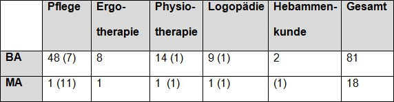 Für die Ergotherapie, Physiotherapie und Logopädie ergibt sich ein anderes Bild. Erst Ende 1990 entstanden für diese Berufe erste Studiengänge. Heute gibt es deutschlandweit ca. 30 weiterbildende BA-Studiengänge in den therapeutischen Berufen, die überwiegend an Fachhochschulen angesiedelt sind. Dabei handelt es sich mehrheitlich um additive oder ausbildungsintegrierende Konzepte, die in Kooperation mit Fachschulen realisiert werden. Für Hebammen gibt es bislang zwei Bachelor - und einen Master – Studiengang (siehe Tabelle 1 [Tab. 1]).