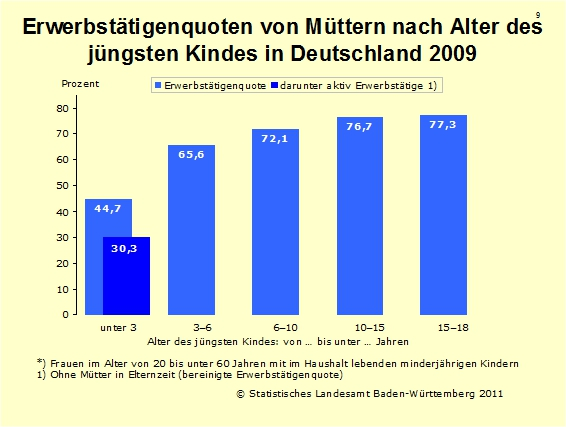 Die Erwerbsbeteiligung der Mütter steigt mit dem Alter des jüngsten Kindes. Fast die Hälfte der Mütter mit Kleinkindern unter drei Jahren sind erwerbstätig. Sind die jüngsten Kinder älter, steigt die Erwerbstätigkeit kontinuierlich an. Anzumerken gilt hier allerdings, dass drei Viertel der erwerbstätigen Mütter Teilzeit beschäftigt ist.