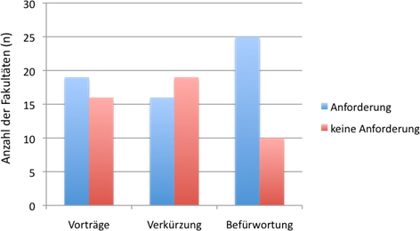 Abbildung 1: Weitere Kriterien: Notwendigkeit wissenschaftlicher Vorträge, Möglichkeit der Wartezeitverkürzung und Notwendigkeit eines Befürworters. n=Anzahl der Fakultäten