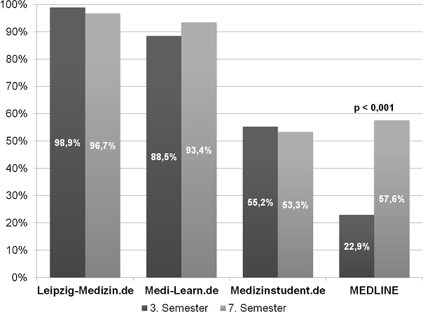 Abbildung 4: Bekanntheitsgrad verschiedener Internetportale im Vergleich zu MEDLINE im 3. und 7. Fachsemester an der Universität Leipzig (n=197, modifiziert nach [1])