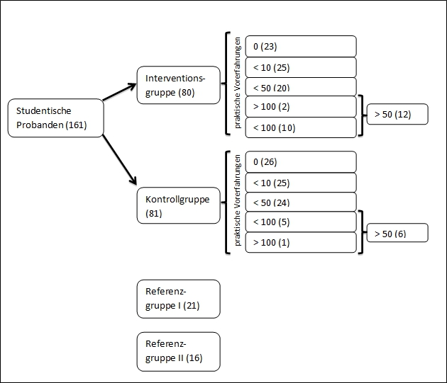 Die Pilotstudie erstreckte sich über den Zeitraum von 6 Monaten an der Medizinischen Fakultät der Technischen Universität Dresden in Form einer prospektiven, randomisierten, kontrollierten Interventionsstudie mit einfacher Verblindung. Von der zuständigen Ethikkommission wurde das Positivvotum eingeholt. (Bearbeitungsnummer: EK 202082008) Als Probanden konnten 161 Teilnehmer des 8. Fachsemesters Medizin per Online-Einschreibung rekrutiert und elektronisch in eine Interventions- (IG) und Kontrollgruppe (KG) randomisiert werden. Diese wurden nach praktischen Vorerfahrungen für die Auswertung weiteren Subgruppen zugeordnet.