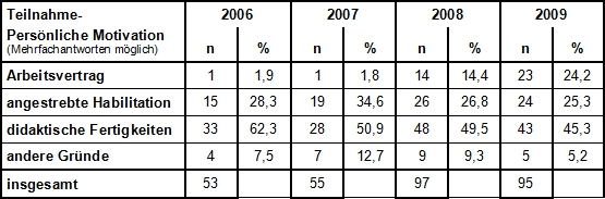 Teilnahme aufgrund einer angestrebten Habilitation gaben fast 50% der Teilnehmenden an (n=84), während eine Teilnahme aufgrund einer Verpflichtung im Arbeitsvertrag weniger häufig genannt wurde (n=39, d.h. 21%). Andere freitextlich genannte Gründe für die Teilnahme waren beispielsweise „Netzwerkbildung mit anderen Lehrenden der Medizinischen Fakultät“ oder „persönliches Ziel in den Ziel- und Leistungsvereinbarungen mit dem Abteilungsdirektor“. Tabelle 3 [Tab. 3] zeigt die Verteilung der persönlichen Motivation zur Teilnahme an dem Training innerhalb der verschiedenen Kohorten.
