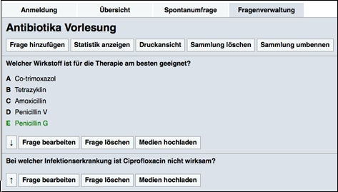 Das Abstimmungssystem "OnlineTED" kann über die Internetseite http://www.OnlineTED.de (http://www.OnlineTED.com, englischsprachige Version) aufgerufen werden. Nach dem Login werden auf der Startseite Informationen für die Teilnahme an einer Abstimmung angezeigt (z.B. den Uniform Resource Locator (URL) der Webseite mit einem aktuellen Zugangscode (Freischaltcode), sowie ein Quick Response (QR) Code) (siehe Abbildung 1 [Abb. 1]). Für Dozenten ist die Startseite Ausgangspunkt für das Starten, Verwalten oder Verfassen von TED-Fragen. Verschiedene Reiter ermöglichen den Zugriff auf die jeweiligen Bereiche: durch Anklicken des Reiters “Übersicht” kann eine bereits erstellte TED-Fragesammlung ausgewählt und gestartet werden. Der Reiter "Spontanumfrage" verweist auf eine Sammlung von voreingestellten allgemeinen Kurzumfragen und -abstimmungen ("ja" / "nein" / "unentschlossen", "sehr gering" bis "sehr hoch", "ausgezeichnet" bis "unzureichend", "trifft zu" bis "trifft nicht zu") für den spontanen Einsatz in Lehrveranstaltungen. Im Bereich "Fragenverwaltung" können bereits bestehende TED-Fragen modifiziert oder neue Fragensets im Multiple Choice (MC)-Format mit Hilfe einer Eingabemaske erstellt werden (siehe Abbildung 2 [Abb. 2]). Das System ermöglicht die direkte Einbindung von Bild- (gif, jpg oder png), Film- (mov, avi oder mpeg) oder Audiodateien (mp3, aac oder wav) in TED-Fragen. Alternativ können Hyperlinks zu Lehrmedien (z.B. Filmclips in http://youtube.com) in TED-Fragen eingefügt werden.