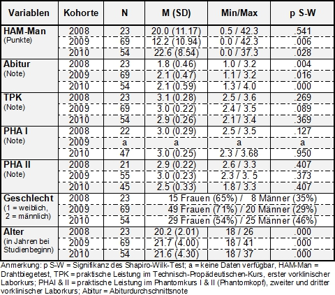 Aufgrund von Studienabbrüchen und -verzögerungen fiel die Teilnehmeranzahl im PHA I und PHA II geringer aus als im TPK (siehe Tabelle 1 [Tab. 1]). Von besonderem Interesse ist der signifikante Unterschied im HAM-Man Ergebnis zwischen den Kohorten (F=15.3; p<.001). Die 2009er-Kohorte weist im Vergleich zur 2008er (p<.05) und 2010er (p<.001) ein signifikant geringeres Gesamtresultat im Drahtbiegetest auf, jedoch zeigte sich kein signifikanter Unterschied zwischen der 2008er und 2010er Kohorte. Die Analyse bestätigt das Vorgehen, die Auswertung der einzelnen Kohorten separiert vorzunehmen. Die Annahme der Normalverteilung musste zwar für die meisten Prädiktor- und Kontrollvariablen zurückgewiesen, konnte aber für die Leistungsvariablen bestätigt werden, wie die Signifikanzstatistik des Shapiro-Wilk-Test anzeigt (siehe Tabelle 1 [Tab. 1]). Sowohl der Korrelationskoeffizient nach Pearson (r) als auch die Regressionsmaße (ß) werden nicht durch Verletzungen der Normalverteilung beeinträchtigt, jedoch ist die Zuverlässigkeit ihrer Signifikanztests anzuzweifeln [23], [24]. Die Prüfung auf Autokorrelation und Multikollinearität mittels des Durbin-Watson-Faktors und der Kollinearitätsstatistik zeigte, dass die Parameterschätzungen zuverlässig sind.