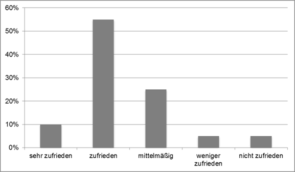 Insgesamt beteiligten sich 20 ÄiW von 34 angeschriebenen potentiellen ÄiW an der Befragung. Von diesen sind 2/3 weiblichen Geschlechts. Sie waren im Median 33 Jahre alt (Spannweite: 28-46), lebten überwiegend in einer Partnerschaft (knapp 80%) und hatten zu über 50% Kinder. Der Umfang von Forschung / Lehre / Patientenversorgung wurde im Median 15 / 5 / 20,5 Std. pro Woche angegeben. Vier der befragten ÄiW planen eine Habilitation, 9 wissen noch nicht, ob sie habilitieren werden, 6 beantworten die Frage nach der Habilitation mit nein. Dreizehn von 20 ÄiW (65%) sind mit ihrer eigenen Weiterbildungssituation zufrieden oder sehr zufrieden (siehe Abbildung 2 [Abb. 2]).