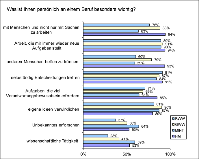 Die Entwicklung und Umsetzung eigener Ideen, wesentlicher Teil einer wissenschaftsorientierten Ausbildung, hat für die Humanmediziner/innen eine unterdurchschnittliche Bedeutung (79,7%; Ø 86,7%). Andererseits ist es für sie überdurchschnittlich bedeutsam, im Beruf selbständig Entscheidungen zu treffen (HM: 90,9%, Ø 87,1%).