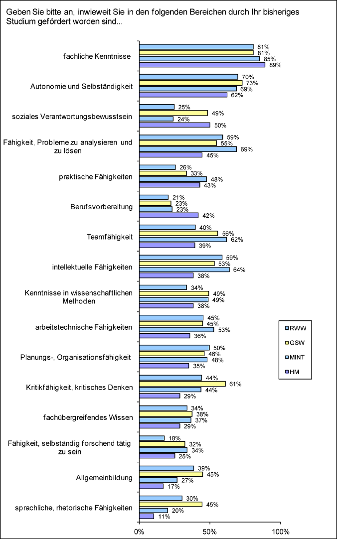Abbildung 7: Antworten auf die Aufforderung „Geben Sie bitte an, inwieweit Sie in den folgenden Bereichen durch Ihr bisheriges Studium gefördert worden sind.“ (Anteil der Werte 4-6 auf einer Skala von 0=gar nicht gefördert bis 6=sehr stark gefördert)