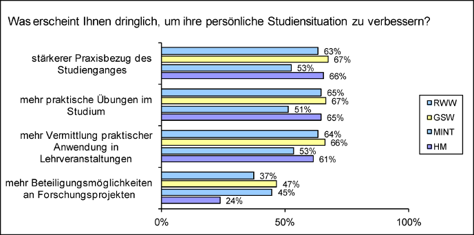 Abbildung 8: Antworten auf die Frage „Was erscheint Ihnen dringlich, um Ihre persönliche Studiensituation zu verbessern?“ (Anteil der Werte 4-6 auf einer Skala von 0-6 mit 6=“sehr dringlich“)