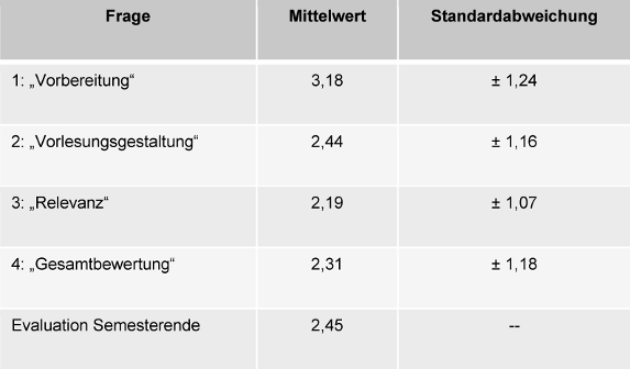 Die Bewertung erfolgte auf einer 6-stufigen Likert-Skala (1=sehr gut bis 6=ungenügend). Anhand dieser Fragen sollten die Lehrenden am Ende jeder Vorlesung eine unmittelbare Rückmeldung erhalten. Am Ende des Semesters erhielten alle Lehrenden sowohl die Ergebnisse ihrer Lehrveranstaltung, als auch die Mittelwerte aller Evaluationen zum Vergleich.