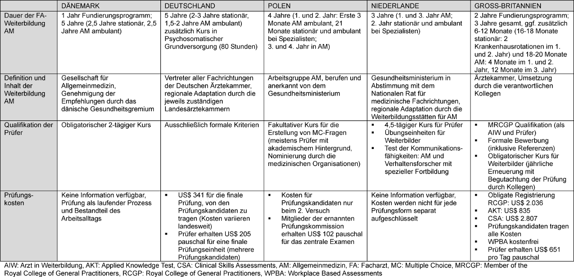 Methode: In fünf Europäischen Ländern (Dänemark, Deutschland, Polen, Niederlande, Groß-Britannien) wurde eine semistrukturierte Befragung in einer Expertenrunde durchgeführt. Die Teilnehmer wurden über verschiedene Aspekte der allgemeinmedizinischen Weiterbildung und Prüfungsmethoden in den jeweiligen Ländern befragt. Falls verfügbar, wurden diese Daten durch Informationen von offiziellen Websites der jeweiligen Länder ergänzt.