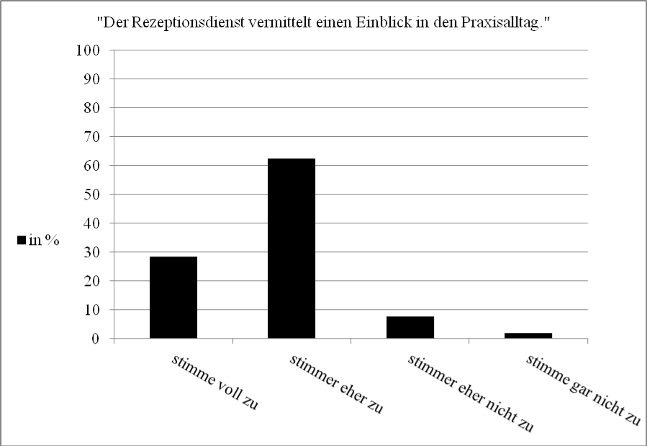 Insgesamt gaben die Studierenden an, durch den Rezeptionsdienst einen Einblick in Praxisabläufe erhalten zu haben. Dies zeigt sich zum einen in den Antworten der Fragebögen (siehe Abbildung 3 [Abb. 3]) und in den Äußerungen in den Interviews. Besonders hervorgehoben wurde hierbei die Patiententerminierung, da die Studierenden während des Rezeptionsdienstes diese nicht nur für ihre eigenen Patienten sondern für alle an diesem Tag zu behandelnden Patienten berücksichtigen müssen und hierbei direkter Ansprechpartner für die Patienten sind.
