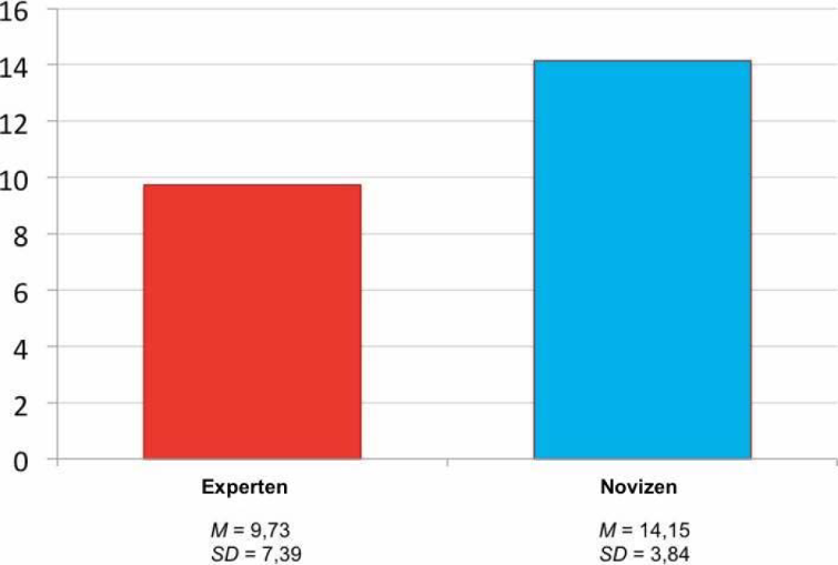 Wie vermutet, besaßen die Experten zudem einen tieferen Grad an Internalisierung gemessen an der Bearbeitungszeit (Sekunden) pro Skriptinformation (MExperten=9,73, SD=7,39) als Novizen (MNovizen=14,15, SD=3,84). Aus dem niedrigeren Mittelwert der Experten kann geschlossen werden, dass diese eine kürzere Zeitdauer zur Verarbeitung der gleichen Menge an Skriptinformationen benötigten als die Novizen oder dass mehr Informationen in der gleichen Zeit verarbeitet wurden, was beides einen höheren Internalisierungsgrad des Kooperationsskripts bei den Experten nahelegt. Der t-Test zur Überprüfung des Unterschieds im Internalisierungsgrad von Experten und Novizen ist mit mittlerer bis großer Effektstärke signifikant (t(38)=2,38; d=0,75). Der Vergleich ist in Abbildung 3 [Abb. 3] dargestellt.