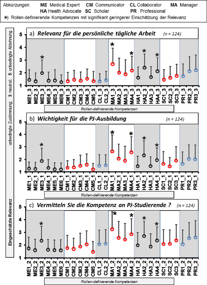Abbildung 1: Einschätzung der Rollen-definierenden Kompetenzen in Bezug auf (a) die Relevanz für die persönliche tägliche Arbeit, (b) die Wichtigkeit für die PJ-Ausbildung und (c) ob die Kompetenz wirklich vermittelt wird. Aufgetragen sind Mittelwerte (Kreise) und Standardabweichungen (Balken, in eine Richtung). Die Bewertungsskala für die Relevanz reichte von 1 („unbedingte Zustimmung“) bis 5 („unbedingte Ablehnung“).