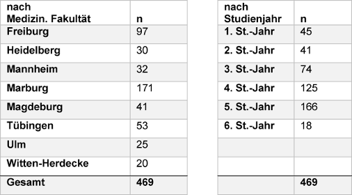 Von Vergleichen zwischen den teilnehmenden medizinischen Fakultäten wurde aufgrund der unterschiedlichen Ausgestaltung der jeweiligen Curricula sowie der nicht anzunehmenden Repräsentativität der Teilnehmer abgesehen.