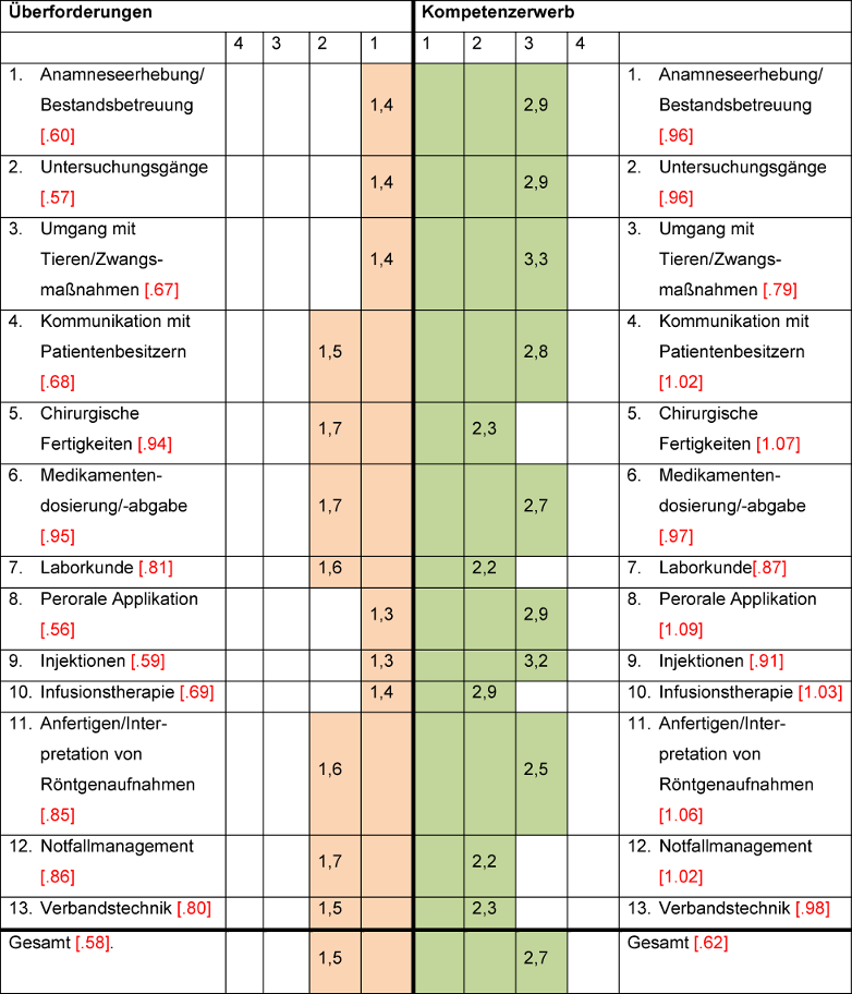 Eine große Anzahl von Studierenden der Tiermedizin zeigt eine erhöhte Belastung bis hin zu erhöhten psychosomatischen Beschwerden in kurativen Praktika, die vergleichbar mit der geschilderten Belastung von Tierärzten/-innen im Berufsalltag ist. Dabei schildern die befragten Studierenden bzgl. der zu erlernenden praktischen Fertigkeiten recht wenige Überforderungsgefühle zu Gunsten eines hohen subjektiven Kompetenzerwerbs. Die höchsten Werte, im Sinne eines Überforderungsgefühls, wurden für die Bereiche Notfallmanagement, Chirurgie und Medikamentenabgabe beschrieben - zugleich überstiegen die Angaben zum Kompetenzerwerb die Angaben zu inhaltsgleichen Überforderungen. Die höchsten Werte konnten für die Bereiche Umgang mit Tieren, Zwangsmaßnahmen sowie Applikations- und Injektionstechniken ermittelt werden. Es kann somit für die letztgenannten Bereiche angenommen werden, dass diese im Studium sehr gut vermittelt bzw. im Praktikum ausreichend Möglichkeiten zum Erwerb geboten werden. Insgesamt wird der Erwerb praktischer Kompetenzen umfangreicher als ein Überforderungsgefühl von Studierenden eingeschätzt. Der Erwerb von praktischen Kompetenzen lässt sich dabei am besten anhand der folgenden Merkmale vorhersagen: „Praktikum als sichere und hilfreiche Wissensbasis für das weitere Studium“, „Identifikation mit den Praktikumsinhalten“ und „Erfahren einer guten Balance zwischen Fördern und Fordern im Praktikum“. Wohingegen Überforderungsgefühle sich anhand der Faktoren, Leistungsdruck und Stresserleben vorhersagen lassen. In diesem Zusammenhang wären Ansatzpunkte für Interventionen seitens der Studierenden, aber auch der Praktikumsinstitutionen und Lehrenden zu sehen.