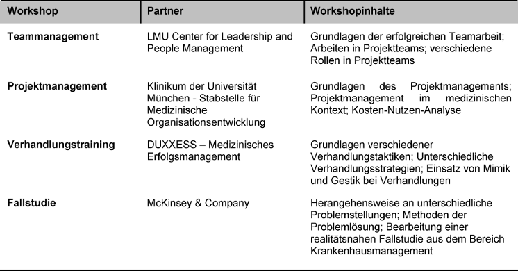 Im Laufe des Kurses wird für die Teilnehmer eine Reihe von Workshops in Zusammenarbeit mit verschiedenen inner- und außeruniversitären Partnern organisiert (siehe Tabelle 3 [Tab. 3]). Dabei sollen vor allem prozedurale Lernziele wie erfolgreiche Teamarbeit, effektives Projektmanagement und zielorientiertes Verhandeln vermittelt werden.