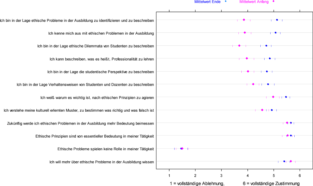 Abbildung 2: Ergebnisse der Selbsteinschätzungsbögen (n=90) zum Thema ethische Probleme in der medizinischen Ausbildung, durchgeführt am Anfang und am Ende des Kurses. Symbole stehen für Mittelwerte, vertikale Striche geben das 95 % Konfidenzintervall an. Die Items wurden nach der Größe der Änderung zwischen vorher und nachher angeordnet.