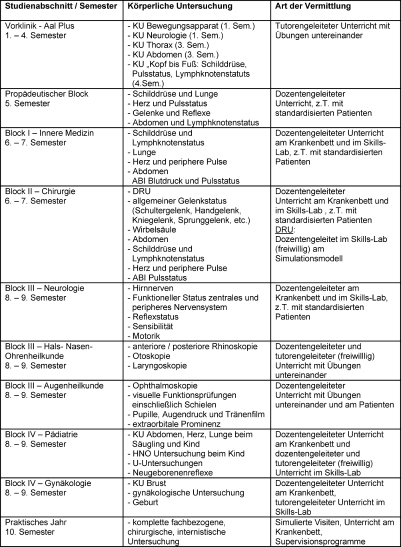 Tabelle 1: Curriculare Einbindung am Beispiel der Vermittlung von Kompetenzen zur körperlichen Untersuchung