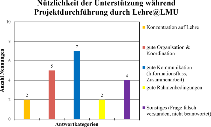 - Nützlichkeit der Unterstützung durch die Projektorganisation Lehre@LMU während der Projektvorbereitung und -durchführung,