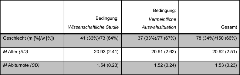 Um die Täuschung aufrecht zu erhalten, konnte in der Bedingung vermeintliche Auswahlsituation nicht vorab auf die Freiwilligkeit der Teilnahme hingewiesen werden. Direkt im Anschluss an die Befragung erfolgte daher die Aufklärung mündlich durch die Versuchsleiterin sowie zusätzlich in schriftlicher Form. Es wurde eine nachträgliche schriftliche Einverständniserklärung eingeholt. Bei fehlendem Einverständnis wären die Daten gelöscht worden. Alle Teilnehmerinnen und Teilnehmer, die einen Fragebogen ausgefüllt hatten, erklärten jedoch im Nachhinein ihr Einverständnis. Das Vorgehen war zuvor mit der Ethikkommission der Universität zu Lübeck beraten und positiv von dieser begutachtet worden (Aktenzeichen 15-072).