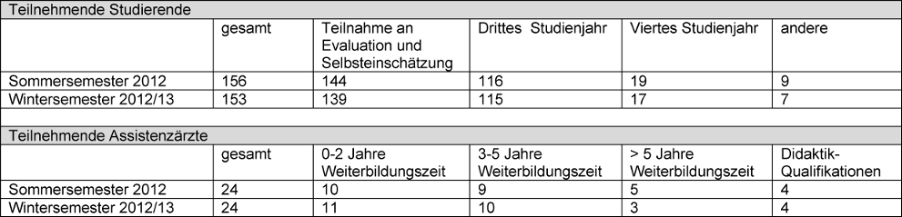 Tabelle 2: Charakteristika der teilnehmenden Studierenden und Assistenzärzte in den beiden Kohorten (Sommersemester 2012 und Wintersemester 2012/13). Alle Assistenzärzte mit Didaktik-Qualifikationen hatten mehr als drei Jahre Weiterbildungszeit.