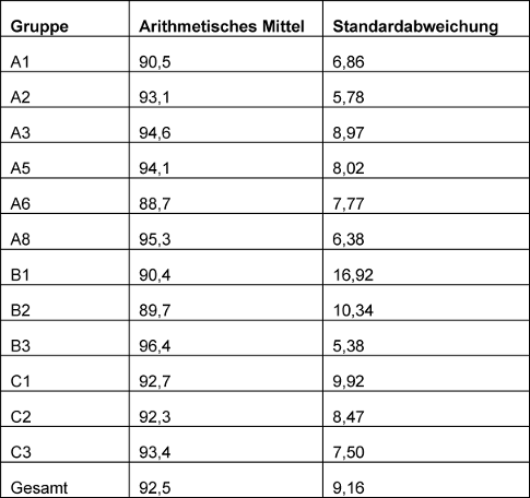 Tabelle 2: Ergebnisse der Kohorte des Wintersemesters 2015/2016: Arithmetische Mittel und Standardabweichungen der Punktzahlen in der Gesamtgruppe und in den einzelnen Kursgruppen