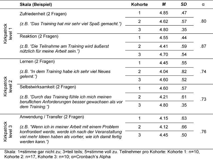 In der vorliegenden Studie wurden die ersten drei Ebenen des Evaluationsmodells erfasst. Die Reaktion der Teilnehmer auf das Trainingsprogramm und die Lerneffekte wurden vornehmlich zu Zeitpunkt T1 gemessen, während die selbstberichteten Verhaltensänderungen wesentlicher Bestandteil der T2-Erhebung waren.