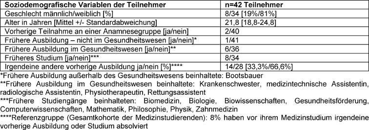 Die Stichprobe bestand aus 42 Studierenden, die an einer Anamnesegruppe als Wahlfach teilgenommen hatten. Die Mehrheit der Teilnehmer waren weiblich. Für die meisten war es die erste Teilnahme an einer Anamnesegruppe. 76,1% der Teilnehmer war in den ersten beiden Jahren (vorklinischer Abschnitt) des Medizinstudiums, nur 23,9% waren im klinischen Abschnitt. Für eine detaillierte Beschreibung der Stichprobe siehe Tabelle 1 [Tab. 1].