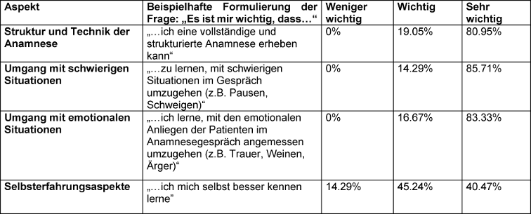 Mehr als 80% der Studierenden fanden es „sehr wichtig“, etwas über die Struktur und Technik der Anamnese zu lernen sowie den Umgang mit schwierigen und emotionalen Situationen zu erlernen, aber nur etwa 40% fanden Selbsterfahrungsaspekte „sehr wichtig“.