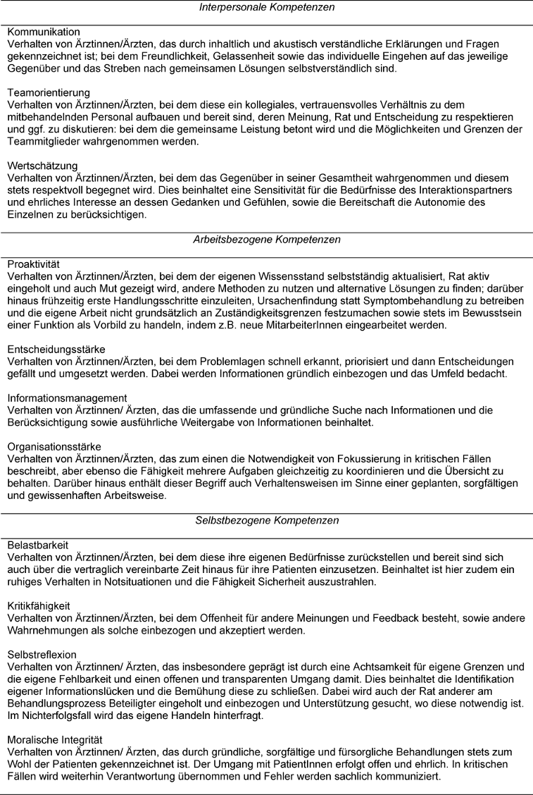 Tabelle 3: Ärztliche Kompetenzen auf der Basis kritischer Ereignisse eingeteilt in interpersonale (Kommunikation, Teamorientierung, Wertschätzung) arbeitsbezogene (Proaktivität, Entscheidungsstärke, Informationsmanagement, Organisationsstärke) und selbstbezogene (Belastbarkeit, Kritikfähigkeit, Selbstreflexion, Moralische Integrität) Kompetenzen