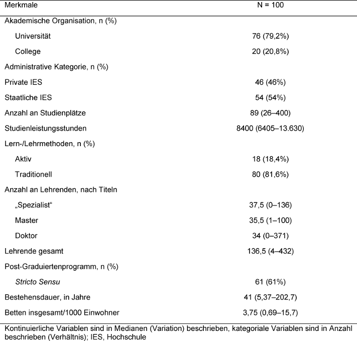 Mit Blick auf die Klassifizierung der medizinischen Ausbildungsprogramme nach ihrer akademischen Organisation zeigte sich, dass 70,6% der Studienprogramme an Universitäten angeboten wurden, obwohl dieser Hochschultyp nur 8% aller Hochschulen Brasiliens ausmacht [17].
