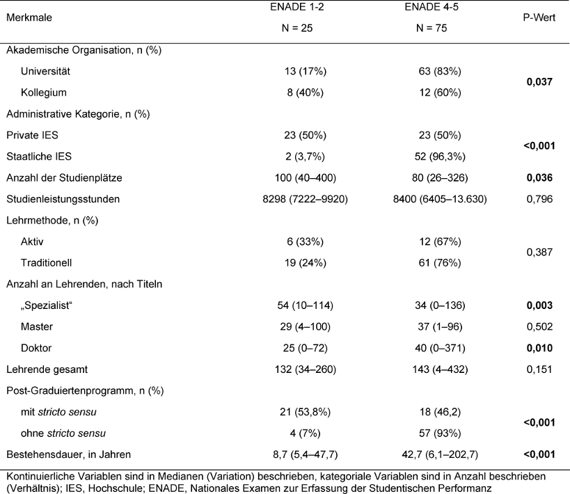 Um eine vergleichende Analyse durchführen zu können, wurden die IES in zwei Gruppen unterteilt: ENADE 1–2 (unbefriedigend: 25 Hochschulen) und ENADE 4–5 (befriedigend: 75 Hochschulen), dabei wurde das Ergebnis ENADE 3, welches ein intermediäres Ergebnis repräsentiert, ausgeschlossen. Somit umfasste die Analyse 100 IES. Tabelle 2 [Tab. 2] zeigt die wesentlichen Merkmale dieser Hochschulen.