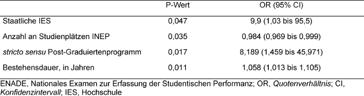 Alle sieben Variablen, die in Verbindung zu den ENADE-Ergebnissen von 2010 zu sehen sind, wurden in das multivariate Analyse-Modell der binär logistischen Regression einbezogen. Es zeigten sich, dass vier Variablen als unabhängie Faktoren bestehen blieben: Staatliche Administration der Hochschule, geringere Anzahl an Studienplätzen, stricto sensu Post-Graduiertenprogramme und längeres Bestehen eines Studienprogramms waren Merkmale, die in Verbindung zu befriedigen Ergebnissen bei der Evaluation (ENADE 4-5) zu sehen waren.