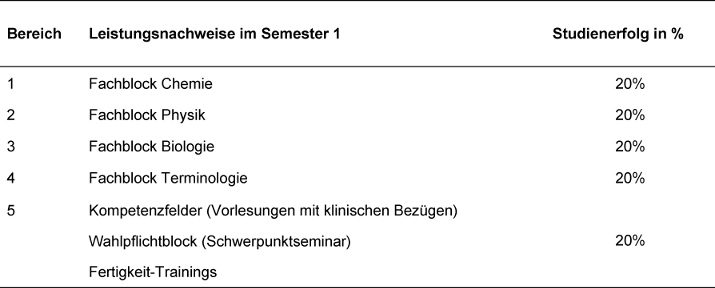 Aufgrund der in Köln fest vorgegebenen Semesterpläne können individuelle Erfolgs- und Misserfolgsquoten von Studierenden jederzeit ausgewertet werden. Die semesterbezogene Studienerfolgsquote errechnet sich über die Anzahl der erfolgreich abgelegten Studienleistungen dividiert durch die laut Semesterplan vorgesehenen Leistungsnachweise. In Köln lässt sich deshalb das erste Studiensemester beispielweise in fünf in ihrer zeitlichen Aufwendung nach etwa äquivalente Bereiche differenzieren [16] (siehe Tabelle 2 [Tab. 2]).