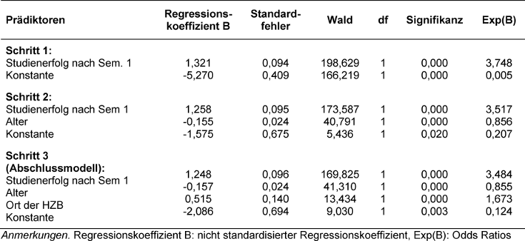Um die schrittweise Entwicklung der Modellkoeffizienten aufzuzeigen, wird im Rahmen der binär-logistischen Regressionsanalyse die Vorwärtsselektion verwendet, so dass die Modellkoeffizienten, angefangen mit dem erklärungsstärksten Prädiktor, ins Modell aufgenommen werden. Von den insgesamt fünf betrachteten unabhängigen Merkmalen erweisen sich drei als signifikante Prädiktoren. Den größten Einfluss auf die Einhaltung der Mindeststudienzeit liefert dabei der Prädiktor Studienerfolgsquote nach Semester 1, da dieser im ersten Schritt ins Modell aufgenommen wird, gefolgt von den Variablen Alter bei Studienbeginn und Ort der Hochschulzugangsberechtigung (siehe Tabelle 3 [Tab. 3]). Keinen signifikanten Einfluss auf die Einhaltung der Mindeststudienzeit liefern in diesem Modell die Merkmale Geschlecht (p=0,944) und Abiturnote (p=0,076).