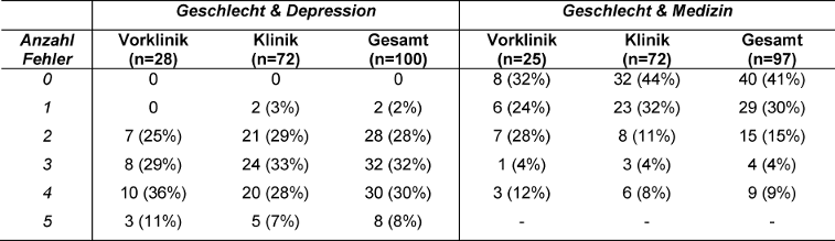 Die Studierenden beurteilen ihre geschlechtersensible Kompetenz als nicht ausreichend (Item: Wie schätzen Sie Ihre Kompetenz in Bezug auf Geschlechterfragen in der Medizin ein?): Nur 14% (17/119) schätzen ihre Kompetenz bezüglich geschlechtersensibler Medizin als gut bzw. sehr gut ein. Neben dieser subjektiven Einschätzung sollte im Rahmen eines Quizes ein zu erwartender Wissens- bzw. Kompetenzzuwachs nach Selbststudium der Beispielartikel quantifiziert werden. Dabei beantwortete keiner/keine der Befragten alle fünf Fragen zu Depression und Geschlecht richtig. 3% (2/72) der Studierenden des klinischen Abschnitts beantworteten eine Frage falsch und Studierende des vorklinischen Abschnitts beantworteten mindestens zwei Fragen falsch. Die vier basaleren Fragen zu Geschlecht und Medizin wurden von 32% (8/25) der Vorkliniker und 44% (32/72) der Kliniker ohne Fehler beantwortet. 12% (3/25) der Vorkliniker und 8% (6/72) der Kliniker beantworteten hier alle Fragen falsch (vgl. Tabelle 3 [Tab. 3]).