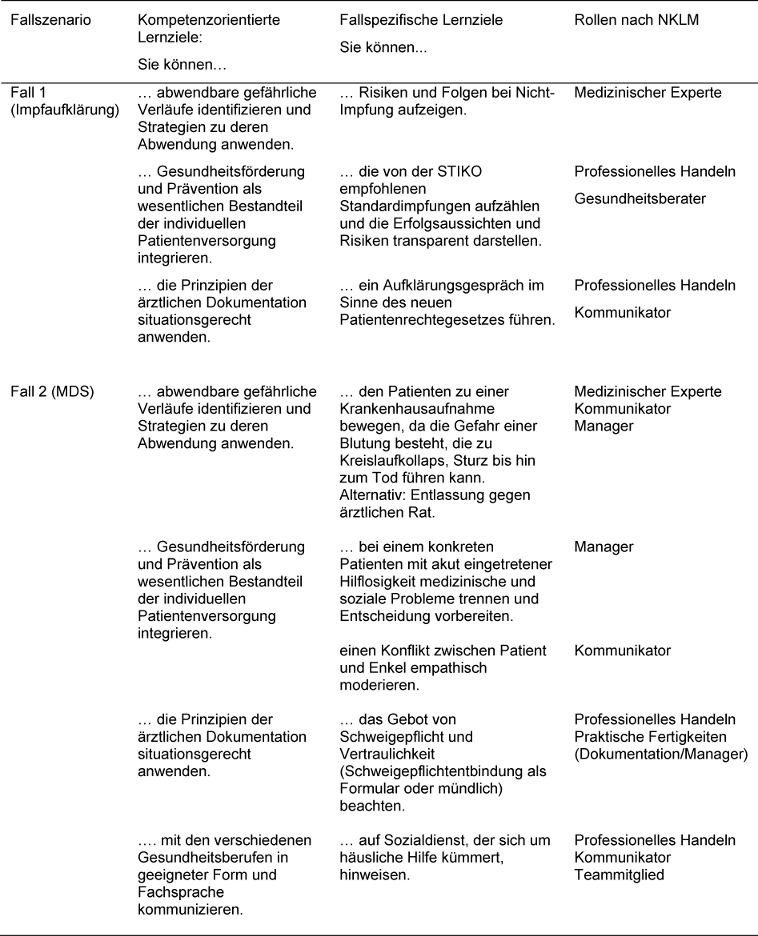 Tabelle 1: Beispielhafte Darstellung der Lernziele und Rollen nach NKLM (Fallszenarien 1 und 2)