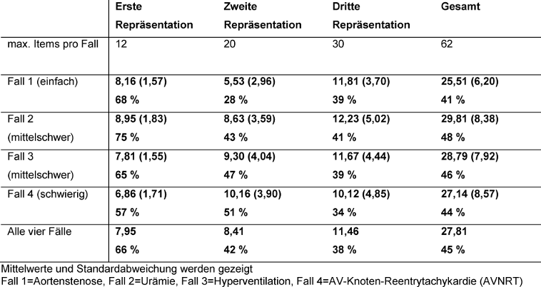 Die Schwierigkeit der Fälle wurde in einer Pilotstudie mit zehn Medizinstudierenden unterschiedlichen Expertisegrades getestet. Die vier Fälle wiesen einen unterschiedlichen Schwierigkeitsgrad auf: Der Fall Aortenstenose (Nr. 1) war simpel und die meisten Studierenden konnten ihn lösen. Die Fälle Hyperventilation (Nr. 2) und Urämie (Nr. 3) waren von mittlerer Schwierigkeit; etwa die Hälfte der Probanden konnte die Fälle korrekt lösen. Der Fall AV-Knoten-Reentry-Tachykardie (AVNRT, Nr. 4) war schwierig aufgrund dieser eher selteneren Erkrankung und des eher komplexeren Elektrokardiogramms. Auch in der tatsächlichen Studie unterschied sich die Diagnoserichtigkeit bezüglich der unterschiedlichen Fälle deutlich: Der erste Fall, Aortenstenose, wurde von 80 % der Probanden richtig gelöst; der zweite Fall, Urämie, wurde von 60%, der dritte Fall, Hyperventilation, von 56%, und der letzte Fall, AVNRT, von 5% gelöst. Die Diagnoserichtigkeit wurde binär codiert (richtig = erfolgreich und falsch = erfolglos) bezogen auf eine Expertenlösung des Falls. Außerdem war im Vorhinein im Expertenkonsens festgelegt, welche Informationen in welchem Fall zur richtigen Lösung notwendig waren. Diagnoseergebnis und Prozess wurden im Hinblick auf die Expertenlösung bewertet. Der Expertenkonsens beruht auf den Einschätzungen und Diskussionen der Fallentwicklerin (LB) sowie den Reviewern der Fälle (zwei fortgeschrittenen Assistenzärzten für Innere Medizin, einem Facharzt für Innere Medizin sowie einem Oberarzt) in Anlehnung an die tägliche klinische Praxis.