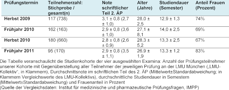 Es wurden die Studierenden berücksichtigt, die von Herbst 2009 bis Frühjahr 2011 den schriftlichen Prüfungsteil des 2. ÄP ablegten (n=1.731). Insgesamt 554 Studierende (32%) willigten ein, an dieser Untersuchung teilzunehmen. Von den 554 Teilnehmern waren 67% weiblich; das Durchschnittsalter zum Zeitpunkt des 2. ÄP lag bei 27,9±4,4 Jahren. Das Durchschnittsalter der Teilnehmer unterschied sich nicht signifikant zwischen den einzelnen Examina. Nähere Details zeigt Tabelle 1 [Tab. 1].