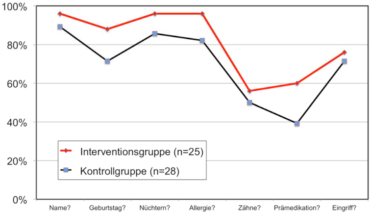 In der Kontrollgruppe des der Intervention vorhergehenden Trimester Januar - März 2018 wurden insgesamt 28 Studierende bei der Abfrage der Sicherheitsfragen des präoperativen Checks beobachtet. In der Interventionsgruppe konnten 25 Studierende observiert werden (siehe Abbildung 1 [Abb. 1]).