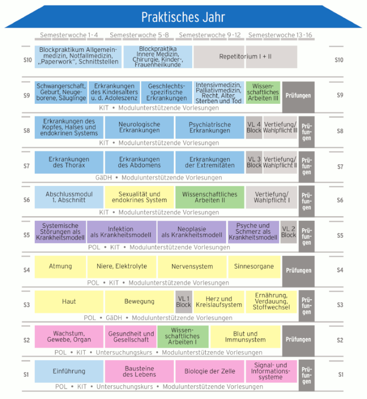 – Unterricht mit Patientinnen und Patienten. Dieser unterteilt sich in den allgemeinen und vertiefenden Untersuchungskurs (Semester 1-4, 118 Unterrichtseinheiten (UE)) und dem Unterricht am Krankenbett (Semester 5-10, 358 UE)