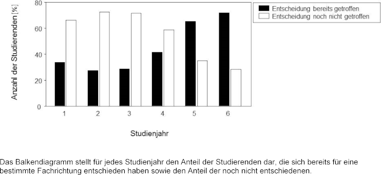 Abbildung 1: Das Balkendiagramm stellt für jedes Studienjahr den Anteil der Studierenden dar, die sich bereits für eine bestimmte Fachrichtung entschieden haben sowie den Anteil der noch nicht entschiedenen.